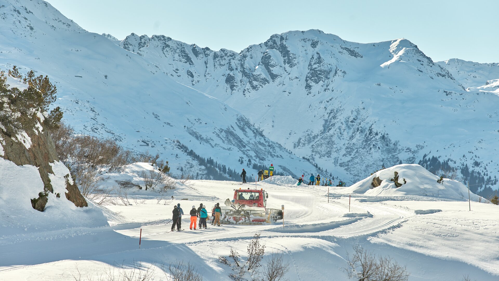 - Sobald die Ski angeschnallt sind, geht’s mit Unterstützung eines Pistenbullys bergwärts aufs Zeinisjoch in Richtung Stausee Kops auf knapp über 1.800 Meter.
