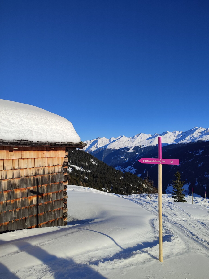 The snowshoe circular hike begins at the Diasbahn mountain station. The marked snowshoe route first follows the path to a quietly situated wooden barn, an ideal spot for a break to enjoy the stunning view of Kappl‘s winter mountains. The return route leads back to the Diasbahn, where the Sunny Mountain Restaurant invites you to relax.