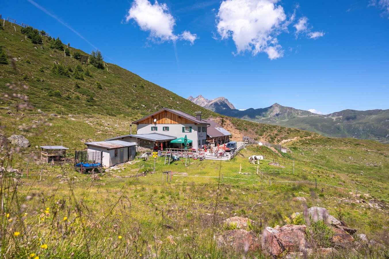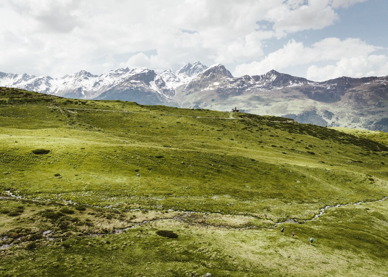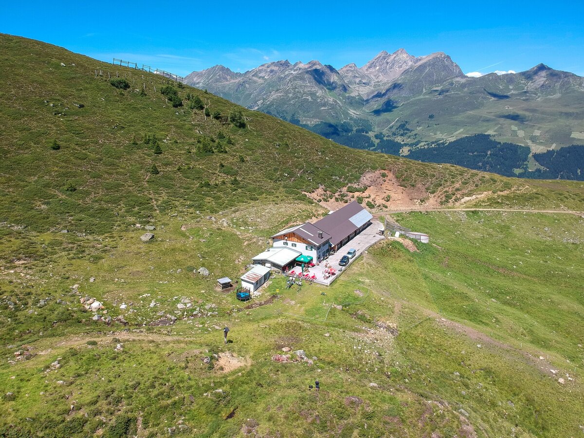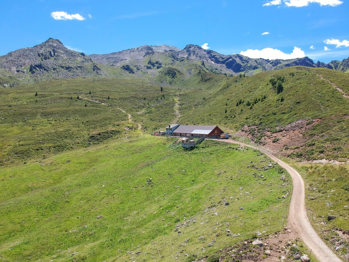 From Ascher Hütte lodge, follow the mountain lodge trail via Medrig to Gratli, where the marked