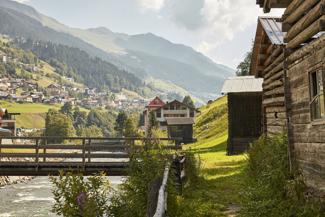 valley, with a wooden bridge leading across Grübelebach creek.