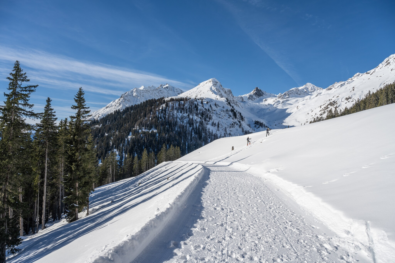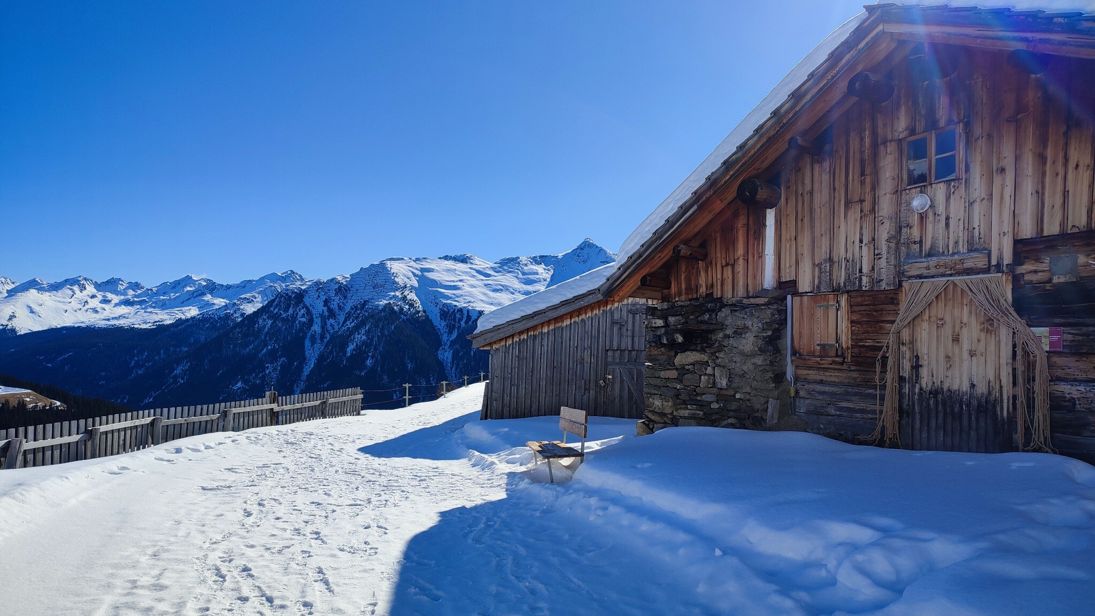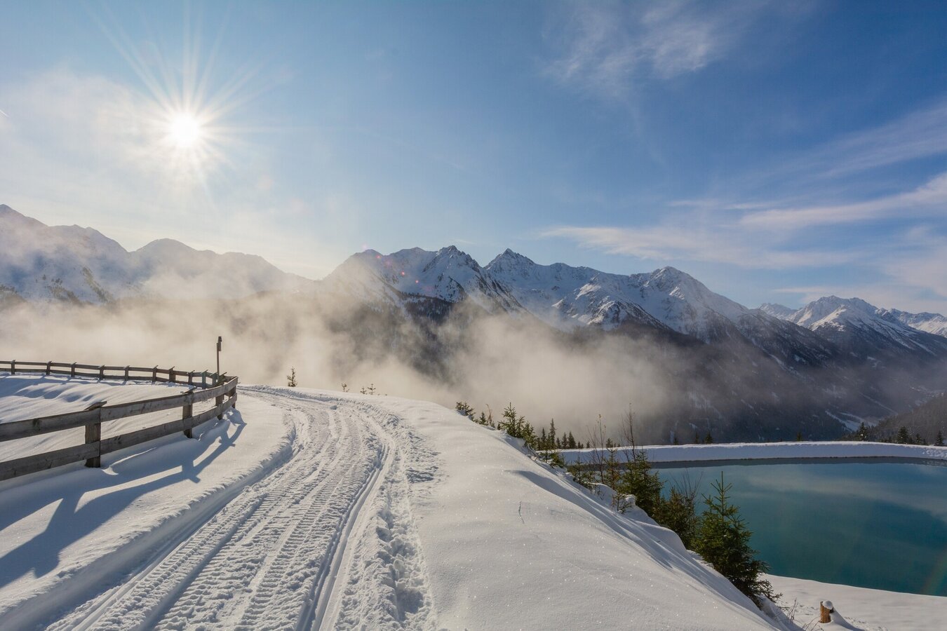 The hike begins at the Diasbahn mountain station in Kappl. First, follow the Müllermahdlen winter hiking trail to Stertabach. From there, cross the snow bridge to the lower Sessladalpe, which is not managed in winter. The Sessladalpe lodge offers a beautiful viewpoint. If you wish, you can take a short detour around the upper reservoir before starting the main hike – it‘s definitely worth it, as benches invite you to relax.